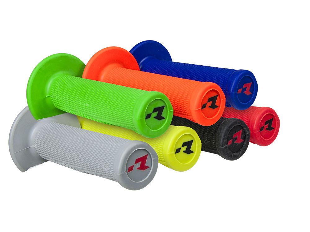 Einfache Montage dank neuster lock-on Technologie von Rtech. Kein verdrehen der Griffe möglich, da der Griff Gummi fest mit der Gasgriffhülse verbunden ist, diese Hülse wird auf der Kupplungsseite mit einem geschraubten Aluminiumring auf dem Lenker festgeklemmt und auf der Gasgriffseite wird einfach der komplette Gasgriff getauscht. Durch Fenster in der Hülse der Kupplungsseite im berreich der Handballen und Fingerspitzen sind die Lock-on griffe von Rtech besonders Komfortabel und fühlen sich wie ein normaler Vollgummi griff an. Eine Vielzahnverzahnung auf dem Gasgriff ermöglicht eine genaue Justierung des Griffes in der gewünschten Position. Das Griffset von Rtech wird inklusive 8 Gasgriff Nocken für die Montage an denn meisten offroad Motorrädern geliefert.