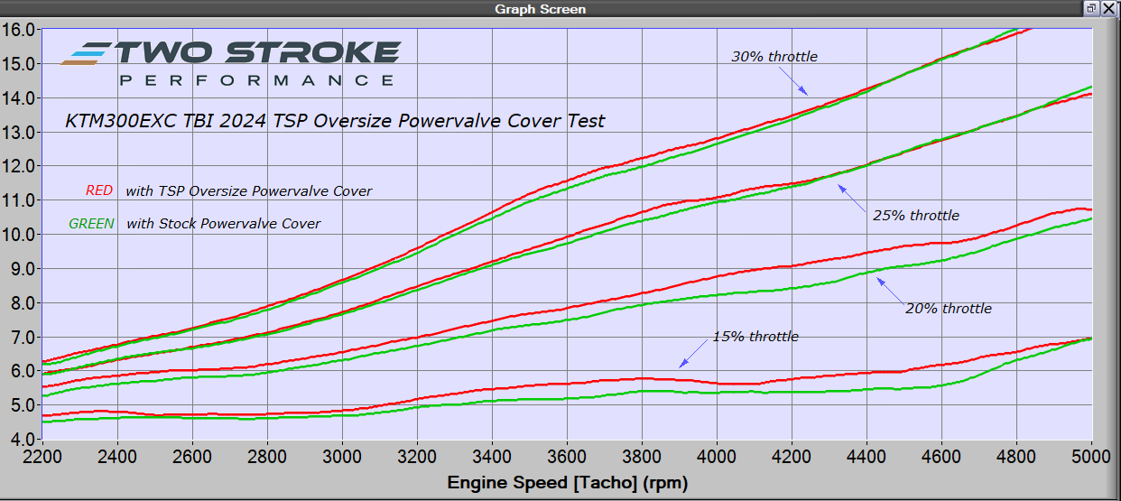 Schauen Sie sich die Prüfstandsergebnisse unseres 2024er KTM300EXC TBI-Werkstattmotorrads an. Dieses Motorrad läuft mit einem TSP-Kopf mittlerer Kompression und einer TSP-ECU-Abstimmung. Durch das Hinzufügen der übergroßen Powervalve-Abdeckung wurden PS und Drehmoment im unteren Bereich noch weiter spürbar gesteigert.