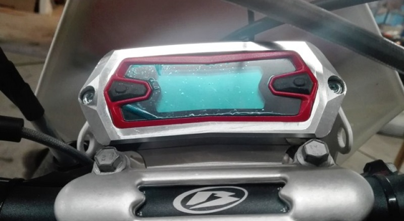 The aluminum speedometer protection from P-Tech protects the expensive speedometer from damage in the event of a fall.