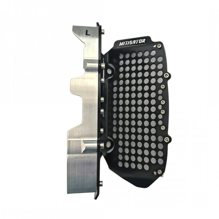 The Mitigator radiator guard is made of high-quality aluminum and is precisely cut using CNC technology. It offers robust protection against impacts and dirt while giving your motorcycle an elegant and stylish look. The guard's lightweight yet robust design ensures that your motorcycle's cooling system remains intact and fully functional when riding off-road. With a perfect fit and easy installation, our CNC Radiator Guard is an essential accessory for any serious off-road rider who wants to protect their bike and look good doing it.