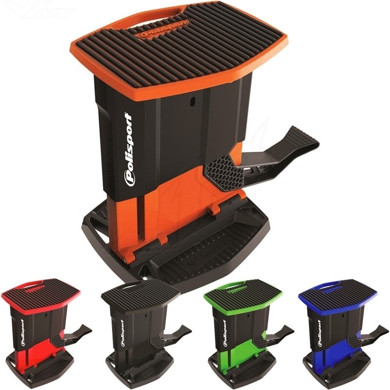The foldable lift stand was developed by Polisport in 2016 to make life easier for the "user" while maintenance work is being carried out on the motorcycle. At the same time, the space required for storage and / or transport is minimized. Using the foot pedal, the motorcycle can be easily lifted with minimal effort. The integrated handle ensures easy and comfortable transport. The hybrid structure is also lighter than competitive products. The rubberized surface ensures the best possible grip on the frame. During maintenance, tools can be stowed in the practical functional bags.